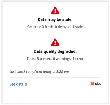 With data health tiles, stakeholders will get an at-a-glance confirmation on whether the data they’re looking at is stale or degraded. It allows teams to immediately go back into Catalog to see more details and investigate issues.